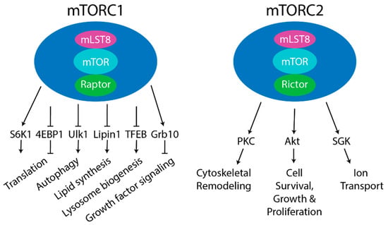 mTORC2 regulates physiological processes through the phosphorylation and activation of downstream substrates like the protein kinase A, G and C (AGC) family. Protein kinase C α (PKCα) at Ser 657 was the first identified substrate of mTORC2 []. Other PKC family members have been shown to be phosphorylated and activated by mTORC2, including PKCδ, PKCξ (Thr 560), PKCγ, and PKCε to regulate cytoskeletal remodeling and cell migration [,,]. mTORC2 phosphorylates Akt on Ser 473 to promote cell survival, proliferation and growth []. Akt mediates these processes through the subsequent phosphorylation of substrates such as Forkhead box O1/3 (FoxO1/3a) at Thr 32 and Ser 253, glycogen synthase kinase 3 β (GSK3-β) at Ser 9, and tuberous sclerosis complex 2 (TSC2) at Ser 939 and Thr 1462 [,,,]. Lastly, through the phosphorylation of serum/glucocorticoid-regulated kinase 1 (SGK1) at Ser 422, mTORC2 controls processes like ion transport and cell growth []. mTORC2 will not be discussed further in this review, and mTORC2 has been reviewed elsewhere [,,].