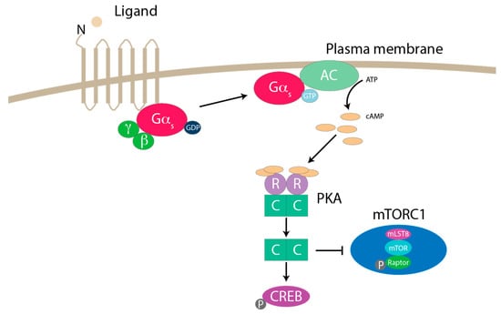 PKA is a Ser/Thr protein kinase holoenzyme that contains two catalytic and two regulatory domains []. The catalytic subunits release when two molecules of cAMP bind to each of the regulatory subunits []. Regulatory subunits (RI and RII) exist in either I/IIα or I/IIβ. RI subunits localize mainly to the cytoplasm, while RII subunits are found at membrane organelles [,]. Recently our lab uncovered the molecular mechanisms by which GPCRs-Gαs signaling can regulate mTORC1 []. Specifically, we found that Gαs-coupled GPCRs increase cAMP to activate PKA and inhibit mTORC1 through the phosphorylation of Raptor on Ser 791 (Figure 4). One report showed that PKA phosphorylates Raptor on Ser 791 to promote mTORC1 activation in 3T3-L1 adipocytes []. However, a previous study had contrasting results showing that mTORC1 inhibition and active PKA signaling promote lipolysis in 3T3-L1 adipocytes []. Additional literature has demonstrated a relationship between cAMP signaling and mTORC1 activity. Interestingly, cAMP has been observed to either stimulate [,,,,] or inhibit [,,,,,] mTORC1 activity, depending on the cell line experimentally used. For example, luteinizing hormone/human chorionic gonadotropin (LH/hCG) mediated activation of cAMP was shown to promote mTORC1 activity and increase primary theca-interstitial (T-I) cell proliferation []. In MEF and HEK293A cells however, the increase of cAMP by pharmacological activation inhibited mTORC1 activity through PKA []. One study in neurons showed that PKA and mTORC1 activity correlated in promoting protein synthesis []. Moreover, another report showed that in striatonigral medium spiny neurons (MSNs), activation of mTORC1 requires PKA signaling []. In human adrenocortical cells, PKA stimulation induced the activation of the mTOR pathway []. Similarly, signaling from the prostaglandin E2 receptor and subsequent activation of cAMP and PKA promoted mTORC1 activity through the phosphorylation of S6K1, S6, and 4EBP1 in pancreatic cancer (PANC-1) cells []. Thus, cAMP-PKA signaling can activate or inhibit mTORC1 depending on the cell type.