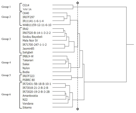 We carried out a hierarchical cluster analysis based on G50, MGT, E50, MET, plant EU, PH, and PHU under four soil moisture conditions (5%, 10%, 15%, and 20%). Cluster analysis divided the 27 genotypes into six groups (Figure 1). All the O. glaberrima were included in either Group 1 (G1) or Group 3 (G3), and G1 consisted entirely of O. glaberrima. Group 2 (G2) had three genotypes of O. sativa and one NERICA genotype. Group 4 (G4) contained five genotypes from four different origin countries: the Philippines, Japan, Ghana, and Guinea. Group 5 (G5) contained two genotypes from the Philippines. G2 and G5 include genotypes that have anaerobic germination (AG) + Sub1 (Submergence 1) gene (IR07F292, IR07F323). Group 6 (G6) consisted of seven genotypes: two upland genotypes from India, two genotypes originating from Ghana, and three genotypes from the Philippines.