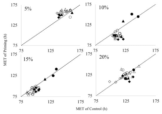 Relationship between control and priming of mean emergence time (MET) in the four soil moisture conditions. The dotted line indicates position of the x value equal to y value. Each plot shows one condition. Black circles, black rhombuses, white circles, white rhombus, black triangles and white triangles indicate genotype group1, 2, 3, 4, 5 and 6, respectively. Genotype groups are determined by cluster analysis (illustrated in Figure 2).