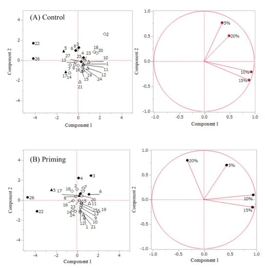 Figure 3A,B shows the results of principal component analysis based on the MET of control and primed seeds under the four soil moisture conditions. The symbols in the figures show the genotype groupings determined by cluster analysis (illustrated in Figure 1). G1 genotypes show a low score for component-1 both in control (Figure 3A) and primed seeds (Figure 3B), indicating that these genotypes have low plant emergence ability either with or without priming. Primed G2 genotypes were plotted near the 20% and 5% axis, suggesting that these genotypes have the potential to adapt to severe stress conditions via seed priming (Figure 3B). G3 was plotted near the center, either with or without priming (Figure 3A,B). G4 genotypes from control seeds were plotted near the 5% and 20% axis (Figure 3A) but those from primed seeds were plotted near the center (Figure 3B). G5 genotypes had a low score for component-1, but one genotype showed a high score for component-2. G6 genotypes were plotted near the 10% and 15% axis either with or without priming (Figure 3A,B).