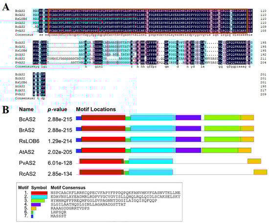 The sequence analysis of BcAS2 protein. (A) The multiple sequence alignment of BcAS2 protein with AS2-like proteins in Brassica rapa (BrAS2, XP_009127444.1), Raphanus sativus (RsLOB6, XP_018468477.1), Arabidopsis thaliana (AtAS2, NP_001077777.1), Pistacia vera (PvAS2, XP_031287864.1), Ricinus communis (RsAS2, XP_002514766.1). The red box contained the LOB conserved domain in different species. (B) The motif analysis of BcAS2, the relevant sequence information is shown at the bottom of the figure, the p-value represents the significance of each motif.