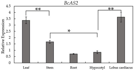 Expression patterns of BcAS2 in different tissues. The expression level of BcAS2 in leaf, stem, root, hypocotyl, lobus cardiacus of 1-month-old pak choi cultivar “NHCC001”. The data represent the average of the three replicates, and the error bars represent the standard deviation between the replicates. ** and * mean significant differences between different tissues, *, p < 0.05, **, p < 0.01.