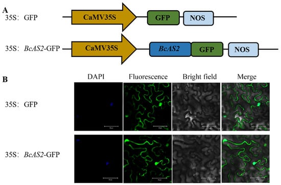 Subcellular localization of BcAS2. (A) The construct of 35S: GFP and 35S:BcAS2-GFP. GFP: green fluorescent protein; NOS: nopaline synthase gene. (B) Transient expression of 35S: GFP and 35S:BcAS2-GFP fusion protein with DAPI (nucleus specific dye) in tobacco. Scale bars = 50 μM.