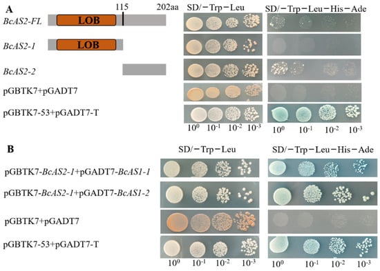 From a previous study, we realized that the AS2 of Arabidopsis thaliana had no transcript activation ability [], but it still needed further verification in pak choi. Therefore, the yeast two-hybrid screen method was performed in our study to validate our hypothesis. The result showed that the yeast Y2H gold strains co-transformed with pGBTK7-BcAS2/BcAS2-2 and pGADT7 (empty vector) could grow well on SD/-Trp/-Leu/-His/-Ade medium as well as the positive control (pGBTK7-53 + pGADT7-T). While the BcAS2-1 and pGADT7 failed to grow on SD/-Trp/-Leu/-His/-Ade medium, indicating that the full length of BcAS2 had transcript activation ability while BcAS2-1 had not (Figure 4A). In order to further verify the interaction between BcAS2 and BcAS1-1/2, we generated the yeast Y2H gold strains co-transformed with pGBTK7-BcAS2-1 and pGADT7-BcAS1-1/2. The result emerged that all the experimental groups can grow on selective medium (SD/-Trp/-Leu/-His/-Ade), while the negative control cannot grow, illustrating that the BcAS2 protein interacted with BcAS1-1 and BcAS1-2 proteins (Figure 4B).