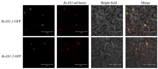 The BcAS2-mCherry and BcAS1-1/2-GFP were co-localized in the nucleus. From left to right, the fluorescence signals in the nucleus, nucleus, and cytomembrane, nucleus due to BcAS1-1/2-GFP, BcAS2-mChery and the co-expression between them, respectively. Scale bars = 50 µM.