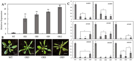 To understand better the regulation of BcAS2 during leaf polarity formation in Pak choi, we generated the transgenic Arabidopsis thaliana with the ectopic expression in BcAS2. The result of qPCR reveled a much higher transcript level of BcAS2 in overexpression lines (named as OE3, OE8, OE9, OE12) compared with WT (Figure 6A). Further, it was obvious that the leaves of overexpression lines presented the upward curling phenotype (Figure 6B), which is in line with the transgenic AS2 lines in Celosia cristata []. We further examined the transcription levels of eight genes (AtYAB3, AtYAB2, AtYAB3, AtKAN1, AtKAN2, AtKAN3, AtARF3, AtARF4) which have been reported that they were related to leaf abaxialization in a previous study [,]. Our result showed that the transcript levels of the eight genes were extremely reduced in transgenic BcAS2 lines compared with WT (Figure 6C). Therefore, we speculated that the curly leaves of BcAS2 transgenic plants may be attributed to the interaction between abaxial and abaxial polarity regulators, but the specific regulatory pathway remains to be studied.