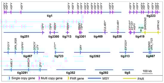 Analysis by PCR of the 30 largest putative Y contigs (cutoff size 200 kb) and all contigs containing putative Y genes (Table S1; Figure S3) confirmed 18 contigs with a cumulative size of 4.48 Mb corresponding to male-specific Y (MSY) (Table 2). Of these, tig419 (~300 kb) was only partially male-specific suggesting that this contig spans the pseudoautosomal boundary in Y (PAB-Y). In addition, 13 contigs with a cumulative size of 3.74 Mb (Table S2) where identified as PAR due to significant homology with alpaca X scaffolds ScfyRBE_77259; HRSCAF = 79152 and ScfyRBE_77260; HRSCAF = 79153 in VicPac3.1 [44], and these contigs contained genes that have been assigned to the alpaca PAR by FISH [56]. Altogether, we confirmed Y origin of 31 contigs with a cumulative size of 8.22 Mb. The 18 MSY contigs were subject to detailed annotation with transcriptome assembly, while the remaining contigs showing PCR amplification in males and females were not further analyzed in this study.