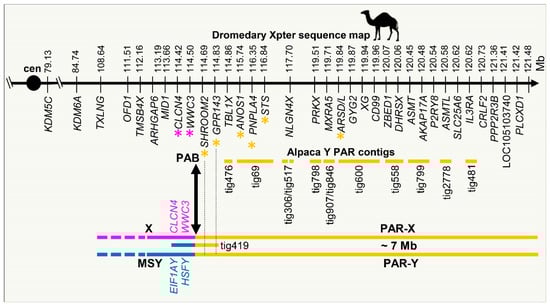 Annotation of the alpaca Y assembly (see Section 3.2) assigned 13 contigs (3.74 Mb) to PAR (Table S2), of which tig419 spanned the pseudoautosomal boundary in Y (PAB-Y) (Figure 3 and Figure 5), so that approximately half of this contig (1–177,307 bp) shared 99.1% sequence similarity with the alpaca X chromosome in VicPac3.1 [44], while no similarity was found for the remainder. The current alpaca X chromosome assembly is highly fragmented and incomplete [44], so we combined information on the gene content of the 13 PAR-Y contigs (Table S2) with a sequence map of Xp terminal region (Xpter) in the recent dromedary reference CamDro3 [49], and reconstructed the likely span and gene content of the alpaca PAR on both sex chromosomes (Figure 5). Sequence alignment of SHROOM2 from the alpaca Y (this study) and X chromosomes (VicPac3.1) showed 98.4% similarity suggesting that this is the last PAR gene before the sex chromosome specific regions start. We tentatively located the PAB between SHROOM2 and WWC3 in the X chromosome, and between SHROOM2 and HSFY in the Y chromosome. Even though a previous study mapped a BAC clone containing WWC3 to alpaca and dromedary PAR [56], our results did not support this as we did not find WWC3 sequences in tig419. Instead, the gene was found in a Y-specific contig tig3291 together with ZFY and AMELY (Figure 3) and after confirming male-specificity by PCR (Figure S3), was denoted as WWC3Y. Based on the demarcated PAB and the dromedary X chromosome sequence map [49], we estimated the approximate size of the alpaca/camelid PAR to be 7 Mb. Thus, the 3.74 Mb of PAR contigs represented 54% of the region in the Y chromosome.