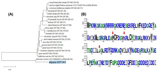 In addition, we analyzed amino acid sequences of alpaca Y transcript ORFs by smartBLAST and identified the most similar amino acid sequences in human and mouse, and in zebrafish as an outgroup (Table S6). Similarity was the lowest for RBMY and HSFY, and the highest for two eukaryotic translation initiation factors—EIF2S3Y and EIF1AY (Table S6). An outstanding example of amino acid sequence conservation was EIF1AY with only three variable residues between the compared species (Figure 6B). Among these, position 50 was maintained in all but humans and position 56 was different in mice, but the same in other species. Position 79 was the same in alpaca and human and different in mouse and zebrafish (Figure 6B). Evolutionary conservation of EIF1AY ORF is even more notable because the gene is Y-linked in alpaca and human, but has been lost from the mouse Y chromosome [19] and is autosomal in zebrafish (NCBI Gene: https://www.ncbi.nlm.nih.gov/gene/).
