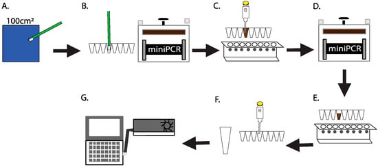 Workflow of the in-situ culture-independent, swab-to-sequencer process for extreme environment microbial profiling. (A) Swabbing of a 100 cm2 area. (B) Insertion of the swab head directly into lysis buffer in a PCR tube and placement into miniPCR for DNA extraction. (C) Bead-based DNA purification (D) DNA amplification within miniPCR. (E) Bead-based PCR amplicon purification. (F) Addition of sequencing control DNA and ONT-based rapid adaptor library preparation. (G) Flow cell loading and MinION sequencing.