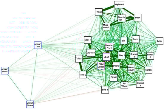Spearman correlation network showing the associations between swabs collected onboard the ISS (outlined in pink) from the Aquarius Habitat on the seafloor (outlined in blue) and from the Human Health and Performance Laboratory building at the NASA Johnson Space Center (outlined in black). Sample association shown from high to low with green to red color and thick to thin lines.