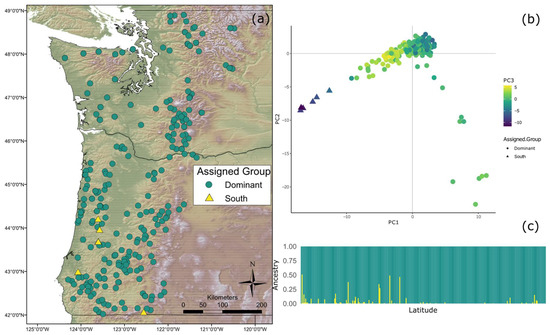 (a) Map of sample locations by population structure. Green circles represent Coastal Dominant (CD) individuals while yellow triangles represent individuals with significant Coastal South (CS) ancestry; (b) Population structure based on principal component analysis (PCA) results. PCA was carried out in Adegenet and only accounts for genotype. The first three principal components are represented by the x-axis, y-axis, and the color, respectively; (c) Structure plot of sampled individuals as determined by fastSTRUCTURE. Each bar along the x-axis represents an individual and the individuals are ordered by latitude (increasing left to right). Green represents ancestry from the CD genetic group, while yellow represents the level of ancestry from the CS genetic group.