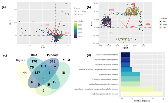 Results of the Genotype-Environment association (GEA) analyses. Results of the multivariate RDA analysis by (a) individuals along longitudinal gradients (color scale), and (b) SNP markers for significant environmental variables such as Precipitation as snow (PAS), Summer Heat Moisture Index (SHM), and continentality (TD) based on 20.3 k genome-wide SNP markers identified for coastal Douglas-fir; (c) Venn diagram of combined results of all GEA methods; and (d) Main gene ontologies of genes identified in all GEA methods.