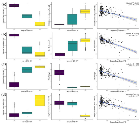 Due to the rapid nature of climate change and the slow nature of plant migrations, proactive strategies should be employed by forest managers to mitigate potential damages resulting from the increased frequency of extreme cold and drought events [86]. As global climate warms at unprecedented rates, species’ distributions are expected to change exposing populations to new environmental conditions [87]. Climate prediction models suggest current climate change could reduce the resilience of coastal Douglas-fir on the warmer margins of its range [21], which will translate in a reduction in fitness and therefore lower wood productivity. Populations in colder areas might also suffer from an abrupt growth decline as a consequence of late spring frosts (more common under warming climates), as previously observed in Canadian populations of Picea mariana [88]. Moreover, populations of Douglas-fir that are isolated on mountains, especially southern populations of the intermountain variety, should be of particular interest due to their higher risk of losing genetic diversity [89]. Our study indicated that these mountainous regions harbor low-frequency alleles that have very important roles in cold adaptation in coastal Douglas-fir. As predictions of future climate variation improve, so should our understanding of the role of phenotypic variation in the potential for adaptation to changing environments.