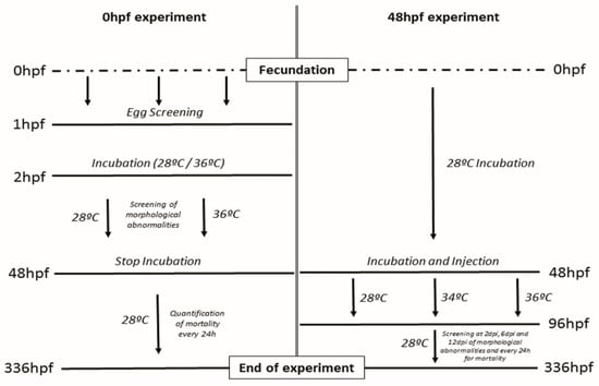 Embryos were collected at 0 hpf and screened after 1 hpf to guarantee a normal cell division, eggs showing abnormal or asymmetric cell division were discarded and replaced by normal ones in order to reach the selected number of embryos for each treatment. Embryos were placed before 2 hpf in Petri dishes at two different temperatures (28 °C and 36 °C) and incubated for 48 hpf screening the embryos for different malformations and mortality at previously determined critical developmental time points (5 h, 10 h, 24 h, 48 h) [15]. After incubation, the hatching rate was quantified, and the embryos were placed at 28 °C to assay the mortality at different time points up to 336 hpf (14 dpf) (Figure 1).