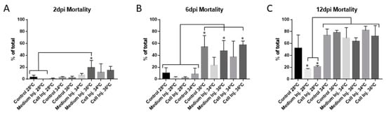 Mortality quantification at different time points comparing the different incubation conditions of the zebrafish embryos. (A) Mortality quantified at 2 dpi. (B) Mortality quantified at 6 dpi. (C) Mortality quantified at 12 dpi. Parameters are expressed as percentages from the total number of embryos assayed for each condition, comparing the incubation of the embryos from 2 dpi to 12 dpi at 28 °C, 34 °C and 36 °C. Error bars represent the standard deviation (SD). One-way ANOVA was performed, and differences were considered significant when * p < 0.05 (n28 °C = 150, n34 °C = 150, n36 °C = 120). The experiment has been performed in triplicate.