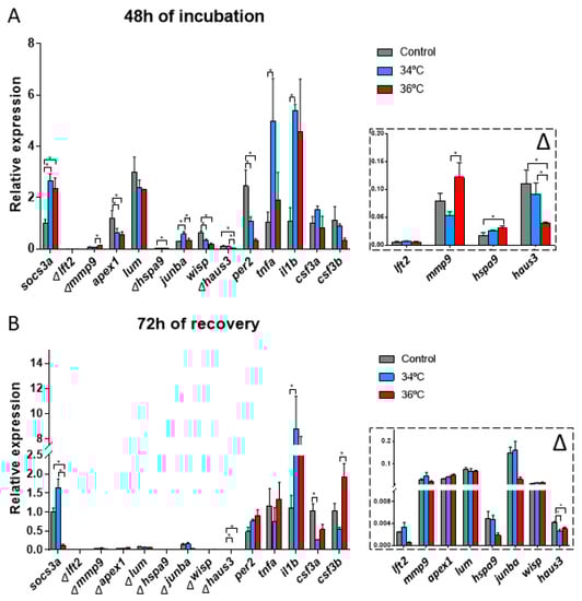 Embryo gene expression analyzed by qPCR after incubation at 28 °C, 34 °C, and 36 °C for 48 h (A) and for 48 h plus 72 h recovery at 28 °C (B). N = 10 embryos/temperature and time point in triplicate. One-way ANOVA was performed, and differences were considered significant when * p < 0.05. ∆ = in the detailed view of marked genes.