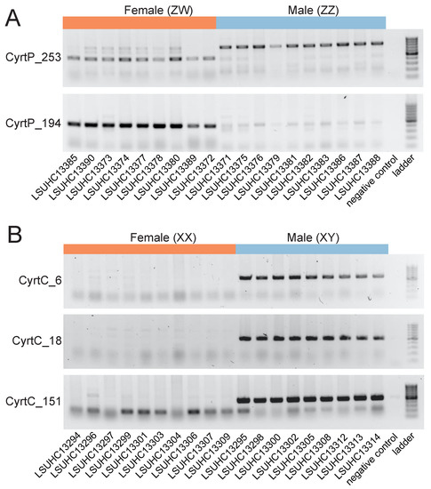 RADseq analysis for C. pharbaungensis included eleven males and four females—barcode errors resulted in several of the female samples not being used for subsequent analysis. We identified 153,555 RAD loci with two or fewer alleles. Of these, 652 markers were female-specific and none were male-specific. We checked the sex-specific markers against the reads from the opposite sex and retained 646 “confirmed” female-specific RAD markers. We designed PCR primers for ten markers and validated two as sex-specific (Figure 1A). Marker CyrtP_253 produced a small band in females (~400 bp) and a larger band in males (~900 bp). These PCR products correspond to amplification of the W allele in females and the Z allele in males. Although the Z and W alleles have diverged to the point that they are different sizes, enough sequence similarity presumably exists that the primers designed for the W allele still amplify the Z allele in males. In females, the W allele is preferentially amplified over the Z allele, producing a single band. PCR primers designed using the W allele will occasionally produce PCR products from the homogametic sex, although these are typically much fainter than those in the heterogametic sex when visualized on a gel [5,46]. Marker CyrtP_194 amplified strongly in females and not in males. These results indicate C. pharbaugensis has a ZZ/ZW sex chromosome system, and the female-specific markers are linked to the W chromosome.