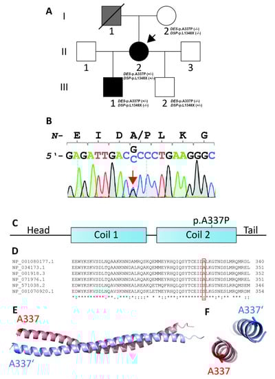 (A) Pedigree of the family. Circles represent females, squares males, slash denotes deceased. Black-filled symbols indicate a cardiac phenotype, grey-filled symbols indicate individuals with suspected cardiomyopathy, and white symbols indicate healthy family members. +/− or −/− indicates heterozygous or wild-type DES-p.A337P and DSP-p.L1348X variants, respectively. The index patient (II-2) is marked with an arrow. (B) Electropherograms of DES-p.A337P (c.1009G>C) in the genome of the index patient (II-2) and her son (III-1). (C) Schematic domain structure of desmin. DES-p.A337P is localized in the coil-2 sub-domain. (D) Multiple species alignment of desmin from Xenopus laevis (NP_001080177.1), Mus musculus (NP_034173.1), Homo sapiens (NP_001918.3), Rattus norvegicus (NP_071976.1), and Danio rerio (NP_571038.2, NP_001070920.1). (E,F) Desmin dimer, modeled using Swiss-Model (PDB ID: 3TRT [27]). Mutant alanine residues (p.A337 and p.A337′) are highlighted in blue and red. Of note, both alanine residues are localized at the opposite sites of the desmin dimer.
