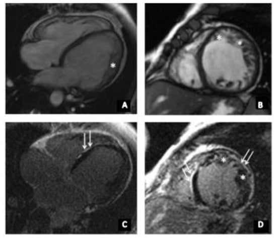 (A–D) cardiac MRI of index patient (II-2). * indicates non-compact myocardium (up to 18 mm). (A) Long-axis four-chamber projection, steady state free prcession (SSFP), and (B) short axis, SSFP, (C,D) Late gadolinium enhancement, areas of non-ischemic (subepicardial) contrast enhancement of left-ventricular walls are indicated with the white arrows.