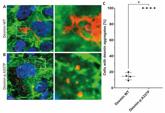 Representative confocal microscopy images of SW-13 cells expressing wild-type desmin (A) or desmin-p.A337P (B) (shown in red). The fluorescence intensity of Alexa-488 conjugated to phalloidin (for F-actin staining) is shown in green and the nuclei were stained using DAPI (blue). Scale bars represent 10 µm. (C) Statistical analysis of desmin aggregate formation revealed for desmin-p.A337P an abnormal cytoplasmic aggregate formation in the majority of transfected SW-13 cells. * p-value < 0.05.