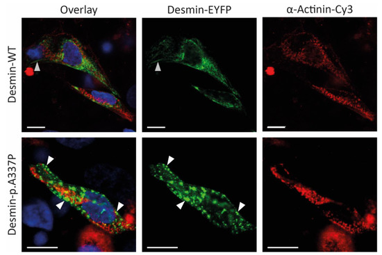 Representative confocal microscopy images of iPSC-derived cardiomyocytes expressing wild-type or mutant desmin (shown in green). The cardiomyocyte marker α-actinin is shown in red and nuclei are shown in blue. Of note, mutant desmin forms cytoplasmic aggregates (white arrows), whereas wild-type desmin forms filamentous structures (grey arrows). Scale bars represent 10 µm.
