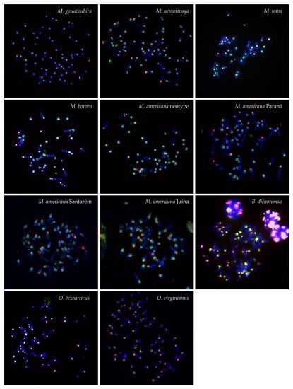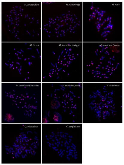 Among large mammals, Neotropical deer (Cervidae, Pecora, Ruminantia, Artiodactyla) [1,2] represent an interesting group of species still lacking comprehensive scientific data. Their taxonomy has been established mostly on the basis of morphology indicating a need for its critical revision and a future systematic research [3,4]. Neotropical deer involve genera Pudu, Mazama, Hippocamelus, Blastocerus, Ozotoceros, and Odocoileus grouped in the tribe Rangiferini, subfamily Capreolinae [4,5]. As in other Cervidae, a variety of karyotypes has been observed in Neotropical deer, ranging from 2n = 70 in Mazama gouazoubira or Odocoileus virginianus, to 2n = 32–34+ Bs in Mazama bororo [6,7]. The 2n = 70 karyotype considered to reflect cervid ancestral karyotype has derived from the hypothetical ancestral karyotype of Pecora (2n = 58) by six chromosome fissions [6,8,9]. However, a series of evolutionary chromosome rearrangements occurred in many deer taxa, which led to a significant diversification of their karyotypes [9]. As with the other Neotropical deer species, a rapid karyotype evolution has been observed in Mazama americana, a taxon grouping several cryptic species currently classified as cytotypes on the basis of their karyotype differences and geographical distribution and reported as M. americana species complex [4,10,11,12]. There is no doubt that the taxonomy and phylogenetics of the Neotropical deer would benefit from new approaches and utilization of new molecular markers.
