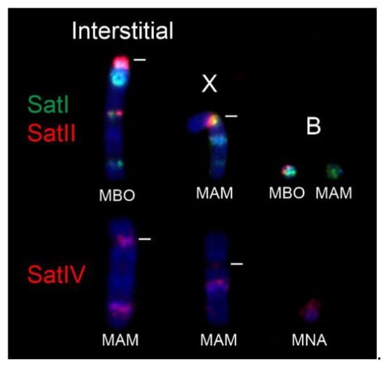 Examples of centromeric and interstitial satI, satII, and satIV signals on autosomes, X chromosomes, and B chromosomes. MBO—M. bororo, MNA—M. nana, MAM—M. americana. Centromeres are indicated by white lines.