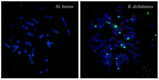 Examples of FISH patterns of the satIII (green) DNA probe in selected species. FISH pattern similar to the results in M. bororo was observed in all species except B. dichotomus.