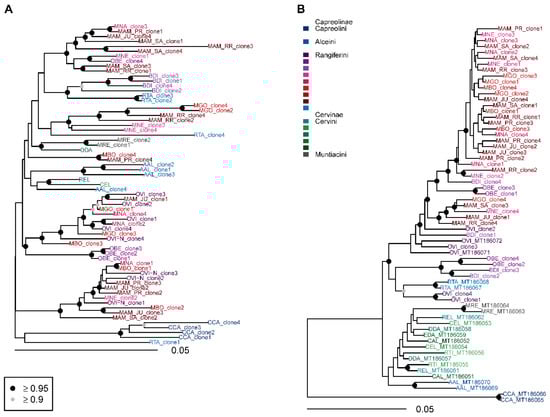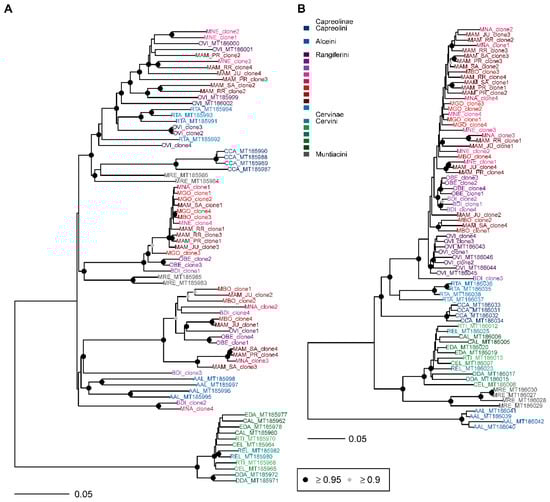 Bayesian phylogenetic trees constructed from cervid satellite sequences. (A) SatI, (B) satII. AAL—Alces alces, BDI —Blastocerus dichotomus, CAL—Cervus albirostris, CCA—Capreolus capreolus, CEL—Cervus elaphus, DDA—Dama dama, EDA—Elaphurus davidianus, MAM—Mazama americana, MBO—Mazama bororo, MGO—Mazama gouazoubira, MNA—Mazama nana, MNE—Mazama nemorivaga, MRE—Muntiacus reevesi, OBE—Ozotoceros bezoarticus, OVI—Odocoileus virginianus, REL—Rucervus eldii, RTA—Rangifer tarandus, RTI—Rusa timorensis. Circles at nodes signify nodes with posterior probability ≥0.95 (black) and ≥0.90 (grey). Unmarked nodes were not supported.