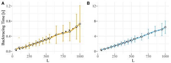 CPU requirements for backtracking the MFE structure in RNALfold. The performance of the implementation ViennaRNA conforms to a linear dependence of backtracking time per nucleotide with base pair span L, i.e., . Shown is the computational overhead for different window sizes L that were obtained from averaging over 100 random sequences of length (A) nt and (B) nt. Error bars denote the standard deviation within the sets of 100 runs, and a linear fit is depicted by a dashed black line.