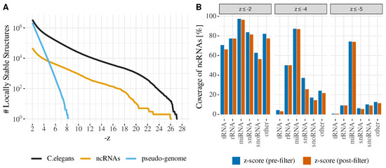 In order to better support genome-wide screens for structured RNA elements, we added options to filter structural components, which is, maximal substructures that are enclosed by a base pair. This is motivated, in particular, by the observation that the secondary structures of many structured small ncRNAs are more stable than expected from their sequence composition [18,19,20]. This effect is particularly pronounced for miRNAs [21]. This relative stabilization for a candidate sequence x is conveniently quantified as a z-score, , where is the folding energy of x, and and denote the mean and standard deviation of the folding energies of an ensemble of sequences with the same sequence composition. Computing can be viewed as a regression problem in terms of parameters that specify the composition of x [22]. Here, we use the SVM model of RNAz 2.0 [23], which explicitly depends on dinucleotide frequencies.