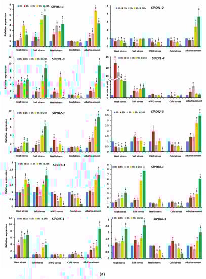 (a,b). Relative expression levels of SlPDI genes in response to various abiotic stresses, viz., heat stress, salt stress, nutrient and water deficit (NWD) stress and cold stress, and phytohormone treatment. Error bars indicate the standard errors of the means of three replicates. *, ** and *** represent the significant difference at p-value ≤ 0.05, ≤ 0.01 and ≤ 0.001, respectively.