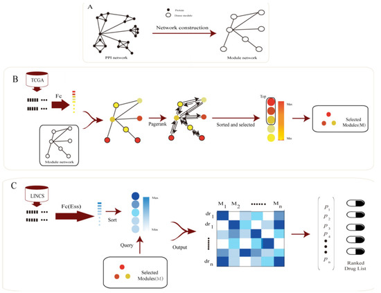 Pipeline of Module Network Based Drug Repositioning (MNBDR). (A) MNBDR detects dense modules in the PPI networks and captures the cross-talks among the modules by permutation test to form a module network. (B) Based on the module network and gene expression data of disease samples, MNBDR applies the Pagerank algorithm to rank the important modules in disease. (C) Using the important modules in disease and the gene expression data of drug stimulating samples, MNBDR applies a new indicator to infer potential associations between drugs and diseases.