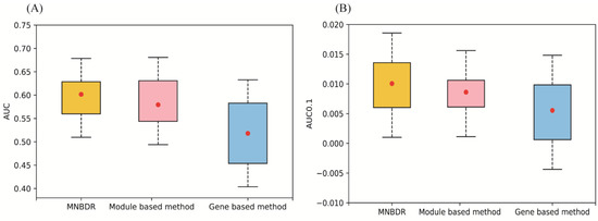Performance of three different methods. (A) AUC. (B) AUC0.1.