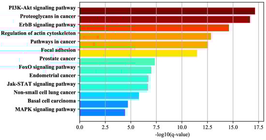 Among the 47 significant pathways (FDR < 1.0 × 10−4), we found that “Pathways in cancer” was on the top, with an FDR of 2.89 × 10−13. What is more, many sub-pathways of “Pathways in cancer” were enriched, such as “MAPK signaling pathway”, “PI3K-Akt signaling pathway”, “FoxO signaling pathway”, “Proteoglycans in cancer”, “Jak-STAT signaling pathway”, “Regulation of actin cytoskeleton”, “Focal adhesion” and “ErbB signaling pathway”. In these sub-pathways, “MAPK signaling pathway” is reported to be essential for cancer-immune evasion in human cancer cells [41]. In addition, “PI3K-Akt signaling pathway” plays a major role not only in tumor development but also in the tumor’s potential response to cancer treatment [42]. Recent studies indicate that numerous components of the phosphatidylinositol-3-kinase (PI3K)/AKT pathway have more frequent amplification, mutation and translocation than any other pathway in cancer patients [43]. About “Proteoglycans in cancer”, the available evidence indicates both an up-regulation of ribosome production and changes in the ribosome structure might causally contribute to neoplastic transformation [44]. Forkhead box O (FOXO) transcription factors are involved in multiple signaling pathways and function as tumor suppressors in a variety of cancers [45]. Apart from this, there were also many pathways in specific cancers, such as “NON-Small cell lung cancer”, “Prostate cancer”, “endometrial cancer”, and “Basal cell carcinoma”.