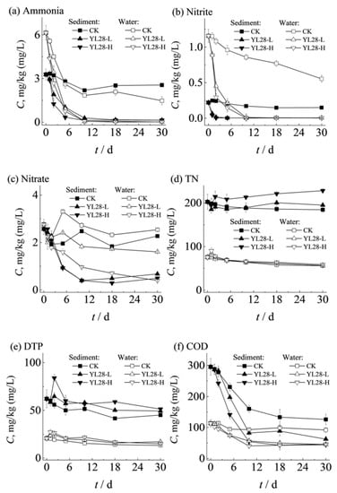 In the CK group, the ammonia removal rates were 14.51% in the sediments and 57.60% in the water column after 5-day incubation for each. However, in the YL28-L group, the ammonia removal rates (Figure 1a) were 68.99% in the sediments and 85.00% in the water column. Addition of a higher concentration of YL28 cells (YL28-H) led to better ammonia removal rates (89.83 and 87.95% in the sediment and water column, respectively) than those in the YL28-L group under the same conditions. Remarkably, only trace amounts of ammonia were detected in the YL28-L and YL28-H groups (4.24–4.28% in sediment, 0.25–0.38% in water column, respectively). However, at least 77.87% of ammonia in the sediment and 23.95% in the water were observed in the CK group. The concentrations of nitrite in water also decreased with the incubation time (Figure 1b) though its concentrations remained unchanged in the sediments. After 10-day incubation, nitrite concentrations in YL28-L and YL28-H groups decreased to the undetectable level in both sediments and water columns, demonstrating that YL28 possessed the strong ability to metabolize nitrite. Nitrate concentrations (Figure 1c) in the sediments and water column remained relatively stable during testing periods (within 30 days) in the control group (CK). YL28-L only slightly contributed to the nitrate removal in the water column while YL28-H significantly decreased the nitrate concentration. However, addition of YL28 increased the concentrations of total nitrogen (TN, Figure 1d) and dissolved total phosphate (DTP, Figure 1e) in the sediments while not much was observed in the water. The COD removal trend was similar to that of ammonia (Figure 1f).