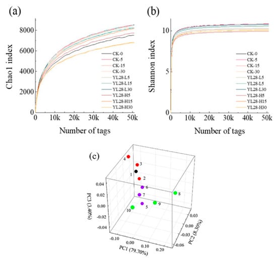 The indices of Chao1 and Shannon of bacterial community in sediment samples. (a) Number of reads to Chao1 index curve; (b) number of reads to Shannon index curve. Significant difference: p < 0.05; (c) Principal components analysis (PCA) of microbial communities. Colors and numbers were used to distinguish different systems and samples. Black: 1, CK-0. red: 2, CK-5; 3, CK-15; 4, CK-30. blue: 5, YL28-L5; 6, YL28-L15; 7, YL28-L30. Green: 8, YL28-H5; 9, YL28-H15; 10, YL28-H30. Significant difference: p < 0.05.