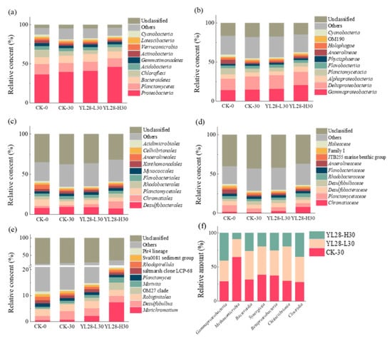 At the class level, Gammaproteobacteria, Deltaproteobacteria and Alphaproteobacteria (Figure 3b, Supplementary Table S3) were the most abundant bacterial members in YL28-H30, which accounted for 20.70%, 16.89% and 6.56%, respectively. There was no significant difference in the abundance of Planctomycetacia and Alpharoteobacteria between CK-30 and YL28-L30 (p > 0.05). The relative abundance of the other bacterial members occupied more than 22%. The addition of a higher concentration of YL28 (YL28-H) significantly increased the abundance of Gammaproteobacteria (at least 37.6%) (p < 0.05). YL28-H had more Gammaproteobacteria compared to YL28-L, which accounted for over 20% of the total abundance of all experimental groups.
