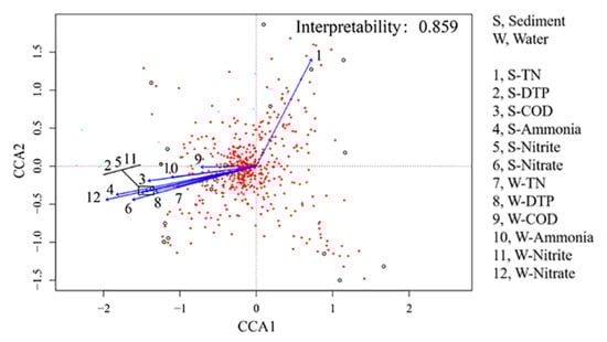 The relationships between environmental factors and bacterial community structure (genus level). Environmental factors include six physicochemical indexes (ammonia, nitrite, nitrate, total nitrogen (TN), dissolved total phosphate (DTP) and chemical oxygen demand (COD)); each was determined in sediments (S) and water column (W); “S” and “W” are used as prefixes to distinguish these indicators.