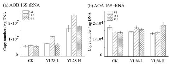 Compared with the CK groups, the supplementation of YL28 significantly increased the relative abundance of AOB (ammonia-oxidizing bacteria) in YL28-L and YL28-H groups (Figure 5a, p < 0.05), but AOA (ammonia-oxidizing archaea) abundance had no significantly change (Figure 5b, p > 0.05). On day 5, the abundance of AOB increased by 27.84% in YL28-L and 74.91% in YL28-H treatments when compared to CK (p < 0.05). On day 15, the relative abundance of AOB increased by at least 80.34% in YL28-L and 279.75% in YL28-H treatments when compared to CK (p < 0.05), respectively. Compared to day 15, the abundance of AOB was reduced significantly at day 30 in YL28-L, which was not significantly different from the CK group (p > 0.05).