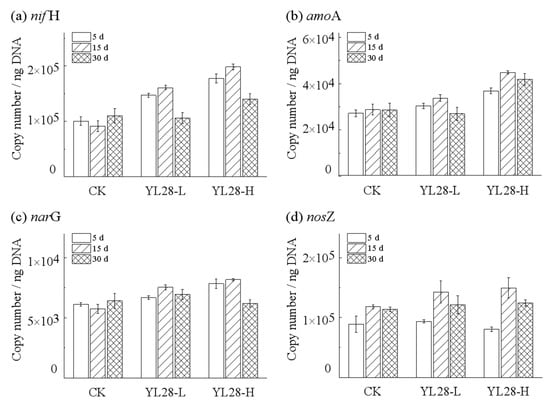 Among the tested four functional genes (nifH, amoA, narG and nosZ) involved in nitrogen metabolism, the changes of nifH copy numbers were significantly affected by the addition of YL28 (Figure 6a), while the abundance of four genes did not change significantly with time (p > 0.05) in CK group. On day 5, the copy numbers of nifH increased by 46.32% in YL28-L and 76.84% in YL28-H compared to CK (p < 0.05). On day 15, the copy numbers of nifH further increased by 76.16% in YL28-L and 117.05% in YL28-H compared to CK (p < 0.05). However, the copy numbers of nifH were significantly reduced on day 30 compared to day 15, the copy numbers in YL28-H and CK groups were significantly different (p < 0.05). The change of amoA was similar to that of nifH (Figure 6b). The copy numbers of narG and nosZ did not change significantly with time (p < 0.05) (Figure 6c,d).