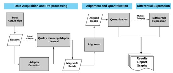 miRNAs are small noncoding RNAs, approximately 22 nts long, considered central post-transcriptional regulators of gene expression []. They are abundant in many organisms and are implicated in a variety of physiological and pathological processes. During the past decade, their role has been widely researched in complex diseases, such as cancer, and several studies have reported specific miRNAs to act either as oncogenes or tumor suppressors []. Small RNA sequencing (sRNA-Seq) enables the wide-scale quantification of small noncoding RNAs, ~18–30 nucleotide-long RNA molecules [], providing new insights concerning the function of crucial regulators. Due to miRNAs’ short length, thorough data preprocessing is very important in sRNA-Seq as adapters may affect a significant portion of the reads. Moreover, the high abundance of sequences able to map in multiple places in the genome poses a challenge in the quantification process, one that can lead to significant misinterpretations of data.