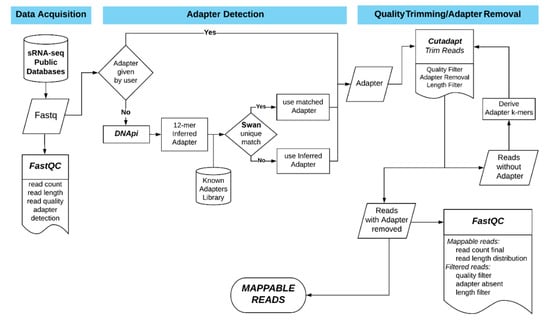 DIANA-mAP preprocessing workflow. It is composed of three individual steps: In the Data Acquisition step, the user can download publicly available datasets from online repositories by providing their accession numbers. The Adapter Detection step either uses a provided adapter sequence or scans the dataset in order to infer the adapter sequence and identify it. The Quality Trimming/Adapter Removal step removes from the dataset low-quality sections and full or partial adapter sequences in order to cleanse the dataset for further analysis.