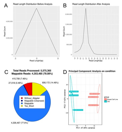 The main results of DIANA-mAP are presented in a table of miRNA expression for each of the provided datasets. Additionally, the user is provided with intermediate statistical results and the subsets of the dataset analyzed are also stored for potential in-depth analysis. Along with a final summarization report, emphasis has been given to the visualization of the results in order to make the analysis easy to follow and understand for beginner and intermediate users alike. The combination of the read length distribution graphs before and after preprocessing provides the user with a quick and comprehensive look at the effects of that analysis step in the data (Figure 3A,B). To further complement that, an overview pie chart of the read distribution after preprocessing is generated (Figure 3C). The Differential Expression Analysis results include overall graphs such as Principal Component Analysis (PCA) between the two conditions as well as expression plots and statistics for the top 100 and top 25 up/downregulated miRNAs. The full detailed list of statistical results for the entirety of the known miRNAs of the organism in study is provided, along with a table of their normalized expression values based on the “median-of-ratios” method []. A Differential Expression Analysis example was conducted using 6 samples from a miRNA expression study on breast tumors using deep sequencing [], the produced PCA plot can be seen in Figure 3D.