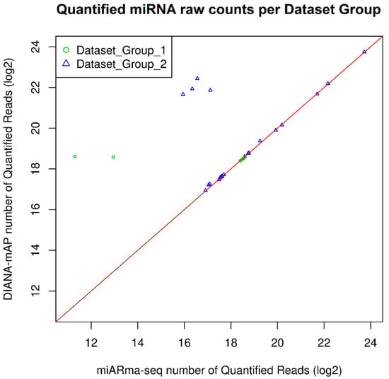 Scatter plot of the quantified miRNA raw counts (Log2-transformed) produced by DIANA-mAP and miARma-Seq tools by analyzing: Dataset_Group_1: 8 publicly available datasets analyzed in the publication of miARma-Seq, also offered as example datasets alongside the tool; Dataset_Group_2: 24 publicly available datasets acquired from SRA and analyzed as examples for this study. Each marker represents the number of quantified miRNA raw counts produced by the two tools for a sample. Markers on top of the red line indicate equal numbers of quantified reads between the tools for that sample. Markers skewing toward a particular side indicates a higher number produced for that side.