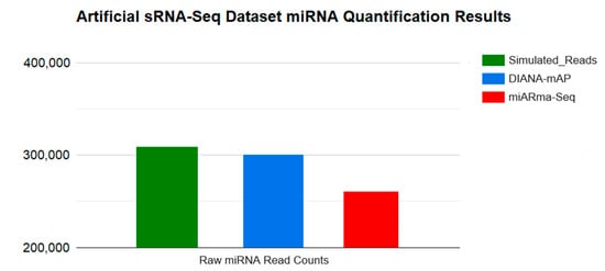 Bar plot of the raw quantified miRNA results for DIANA-mAP and miARma-Seq on an artificial sRNA-Seq dataset. The “Simulated Reads” bar indicates the absolute number of simulated miRNA reads present in the dataset.