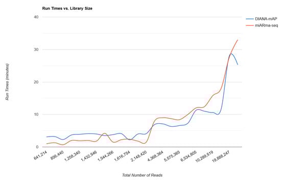 Finally, the evaluation of run time in Dataset_Group_2 for the two programs showed faster performance on deeper sRNA-Seq experiments for DIANA-mAP. On datasets with more than 3 million reads, DIANA-mAP had a run time of 12 min on average compared to 14.8 min for miARma-Seq (Supplementary Table S3). More specifically on the group’s deepest dataset, with 20 million reads (SRR1636963), our tool performed the analysis in 25.3 min versus 33 min for miARma-Seq (Supplementary Table S3). Figure 6 shows the comparative improvement in run times for DIANA-mAP as the datasets increase in size.
