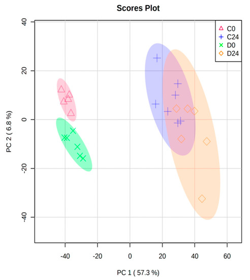 Principal Component Analysis (PCA) biplot of all normalized samples (n = 24) from the 4 groups (C0: control samples at 0 h; C24: control samples at 24 h; D0: diabetic samples at 0 h; D24: diabetic samples at 24 h). Circles show 95% confidence.